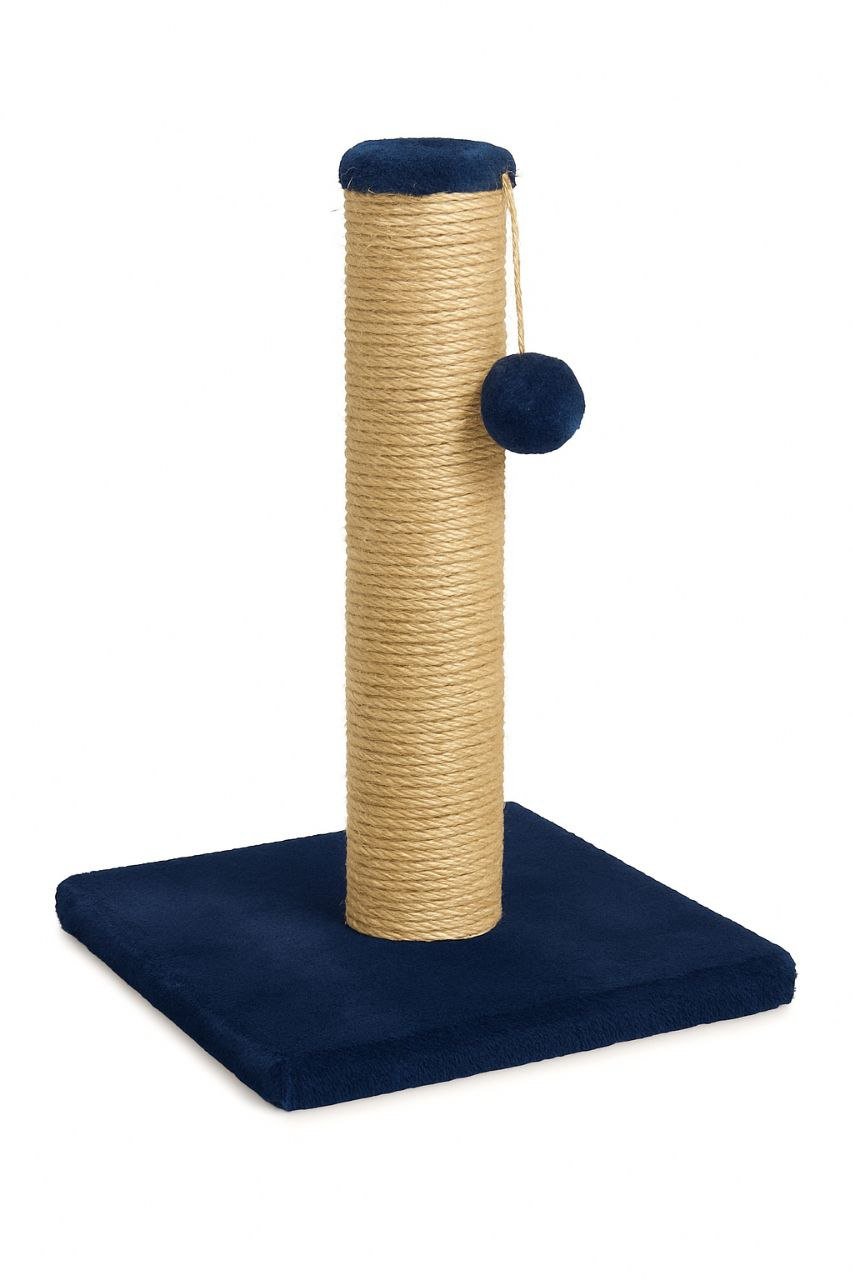 A stylish navy scratching post with a sisal-wrapped pillar and hanging pom-pom toy for feline fun and scratching