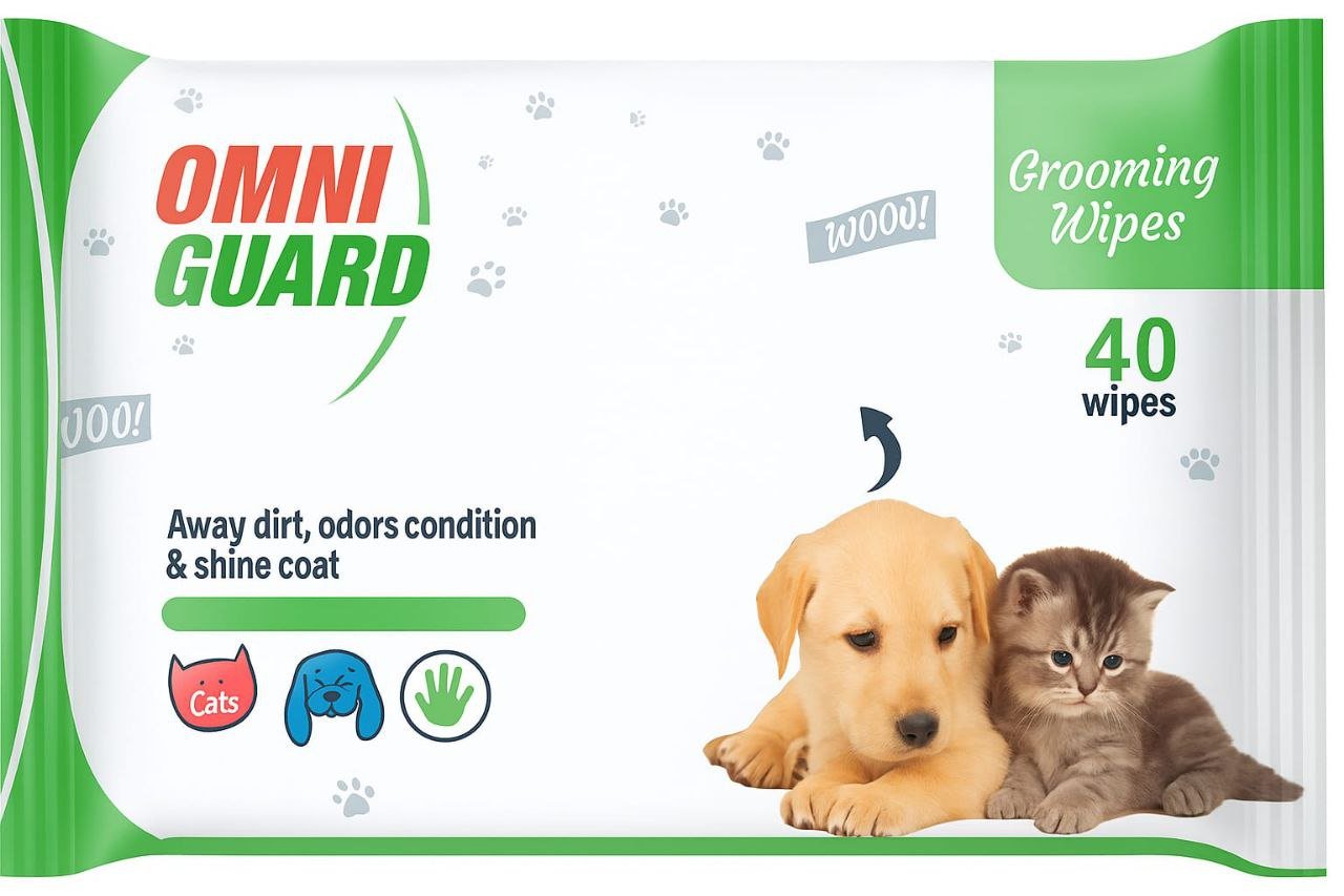 Keep your pets fresh, clean, and happy with OMNI GUARD Grooming Wipes. Specially formulated for both cats and dogs, these convenient wipes help remove dirt, eliminate unpleasant odors, condition their fur, and restore a healthy shine to their coat. Each pack contains 40 soft, gentle wipes suitable for everyday grooming. Whether after a walk, playtime, or in-between baths, OMNI GUARD wipes are the perfect solution for maintaining your pet’s hygiene effortlessly.